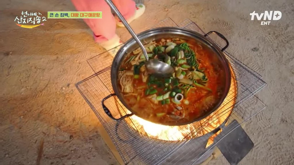 맛있는 식사는 즐거운 대화로 이어집니다. 오늘 잡은 생선으로 직접 요리해 먹는 특별한 경험에 대해 이야기하며 감회가 새로운 듯한 모습인데요. 임지연은 아삭한 콩나물과 향긋한 미나리를 더 먹고 싶어하며 대구탕의 매력에서 헤어 나오지 못합니다. 식사가 마무리될 무렵, 누군가 믹스 커피를 찾습니다. 물은 조금만 넣어달라는 디테일한 요청과 함께, 염정아의 조끼와 믹스 커피가 묘하게 잘 어울린다는 유쾌한 농담까지 오가며 웃음꽃을 피웁니다. 식사부터 후식까지, 언니네 산지직송의 소소하지만 정겨운 일상이 고스란히 담겨 있습니다.